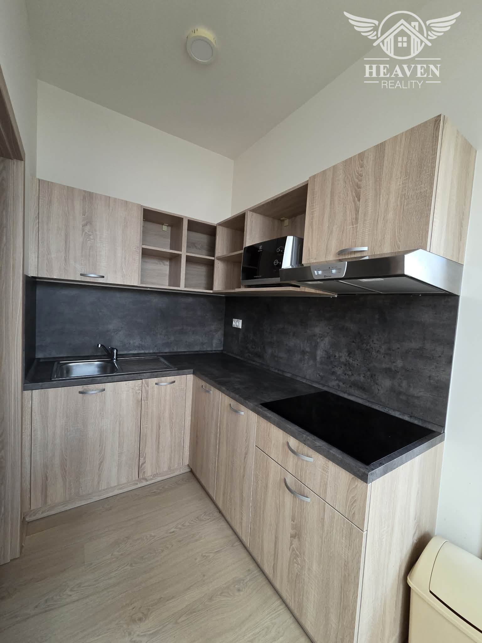 Zariadenie: kuchyňa- kuchynská linka, varná doska s digestorom, mikrovlnka, chladnička s mrazničkou, stôl, stoličky