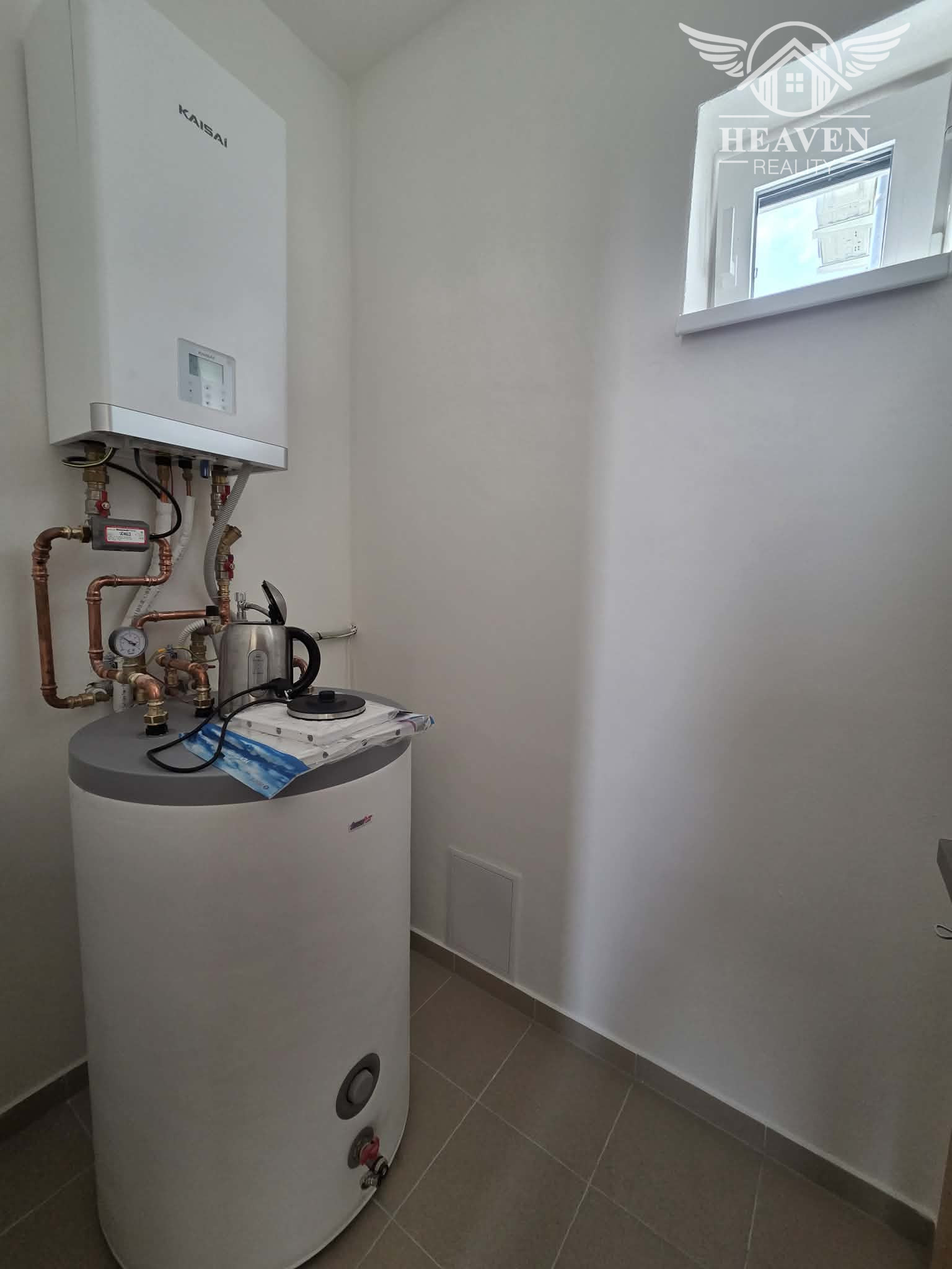 Kúrenie je podlahové napojené na tepelné čerpadlo, ktoré taktiež zabezpečuje ohrev teplej vody.